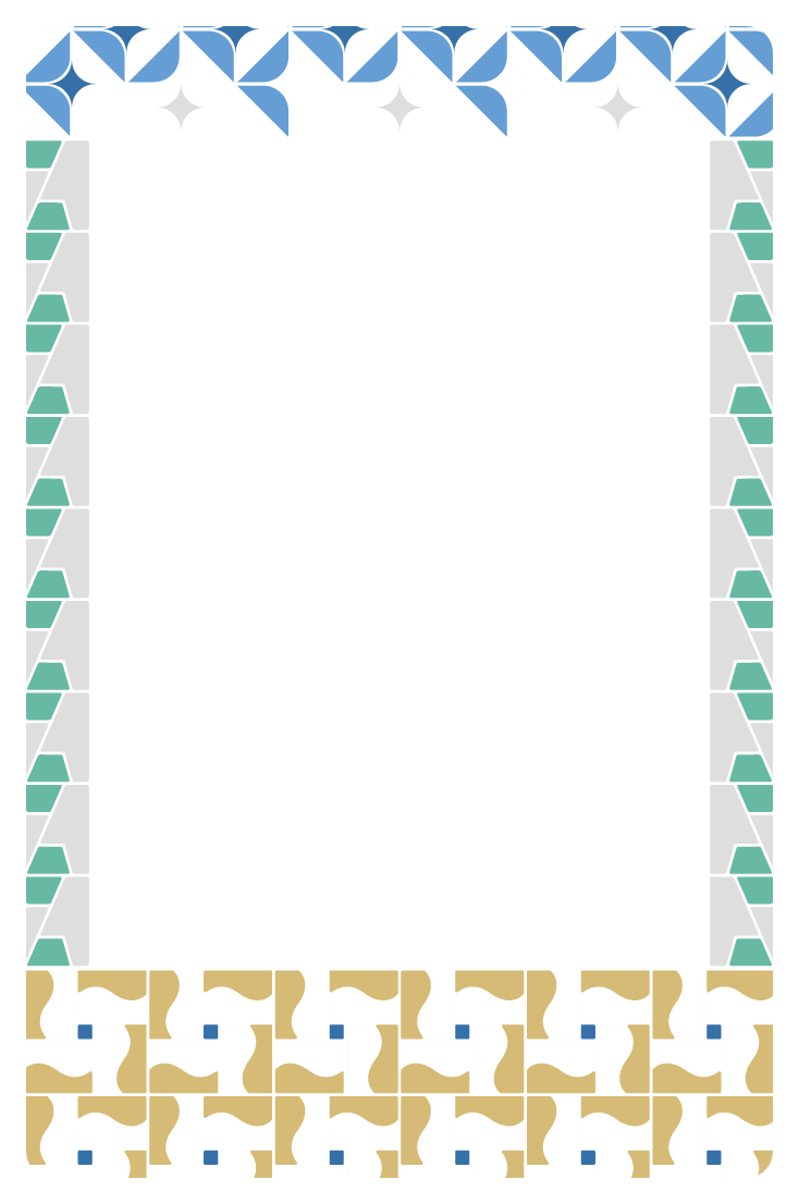 插圖主題:把老屋花磚的幾何韻律疊成相框—上緣藍白風車星紋、兩側薄荷綠階梯磚、下緣沙金旋紋花磚,照片像被老房子的一方壁面擁抱。