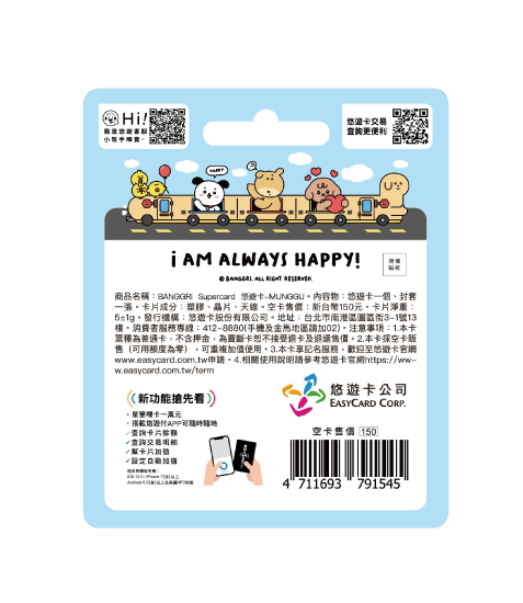 注意事項:1.本卡票種為普通卡,不含押金,為賣斷卡恕不接受退卡及退還售價。2.本卡採空卡販售(可用額度為零),可重複加值使用,詳細使用辦法請參閱內附之使用說明。3.本卡享記名服務,歡迎至悠遊卡官網www.easycard.com.tw申請。4.本卡於合作特約商店消費享UUPON紅利點數回饋,請先至UUPON官網UUPON.TW加入會員。