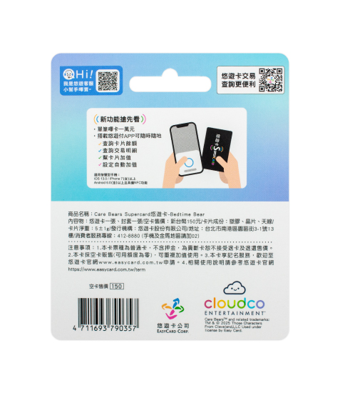 注意事項:1.本卡票種為普通卡,不含押金,為賣斷卡恕不接受退卡及退還售價。2.本卡採空卡販售(可用額度為零),可重複加值使用,詳細使用辦法請參閱內附之使用說明。3.本卡享記名服務,歡迎至悠遊卡官網www.easycard.com.tw申請。4.本卡於合作特約商店消費享UUPON紅利點數回饋,請先至UUPON官網UUPON.TW加入會員。