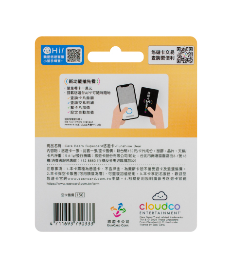 注意事項:1.本卡票種為普通卡,不含押金,為賣斷卡恕不接受退卡及退還售價。2.本卡採空卡販售(可用額度為零),可重複加值使用,詳細使用辦法請參閱內附之使用說明。3.本卡享記名服務,歡迎至悠遊卡官網www.easycard.com.tw申請。4.本卡於合作特約商店消費享UUPON紅利點數回饋,請先至UUPON官網UUPON.TW加入會員。