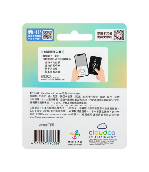 注意事項:1.本卡票種為普通卡,不含押金,為賣斷卡恕不接受退卡及退還售價。2.本卡採空卡販售(可用額度為零),可重複加值使用,詳細使用辦法請參閱內附之使用說明。3.本卡享記名服務,歡迎至悠遊卡官網www.easycard.com.tw申請。4.本卡於合作特約商店消費享UUPON紅利點數回饋,請先至UUPON官網UUPON.TW加入會員。